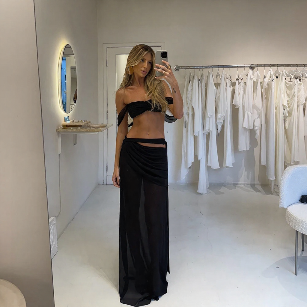 Unveiling the Goddess. Make an unforgettable entrance in the Aphrodite Maxi Set This maxi gown is an expression of opulent resort wear, blending sensual design with sophisticated detailing. Pair it with your highest heels for evening cocktails or an exclusive resort dinner.