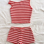 Bold, playful, and made to turn heads. The Valentina Crochet Set features a sleeveless knit crop top paired with matching high-rise shorts in striking red and white stripes. Easy, breezy, and ultra-flattering — this set screams summer fun.