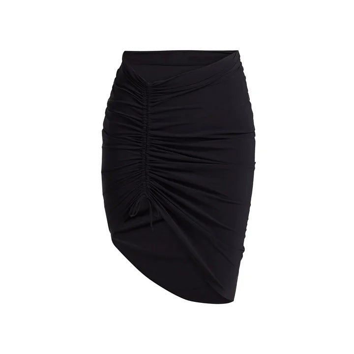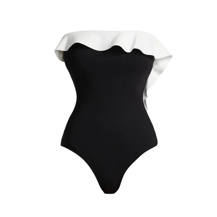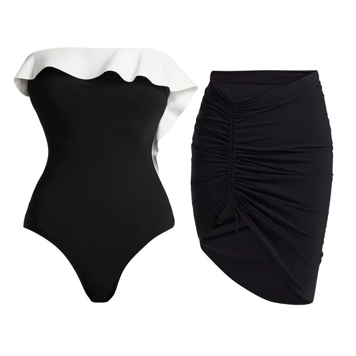 Our Wave Ruffle Swim Set brings vintage glamour to modern swimwear. The black one-piece features an elegant white ruffle neckline for a chic, feminine look, while the ruched skirt adds coverage without compromising style. A pool-to-party essential.